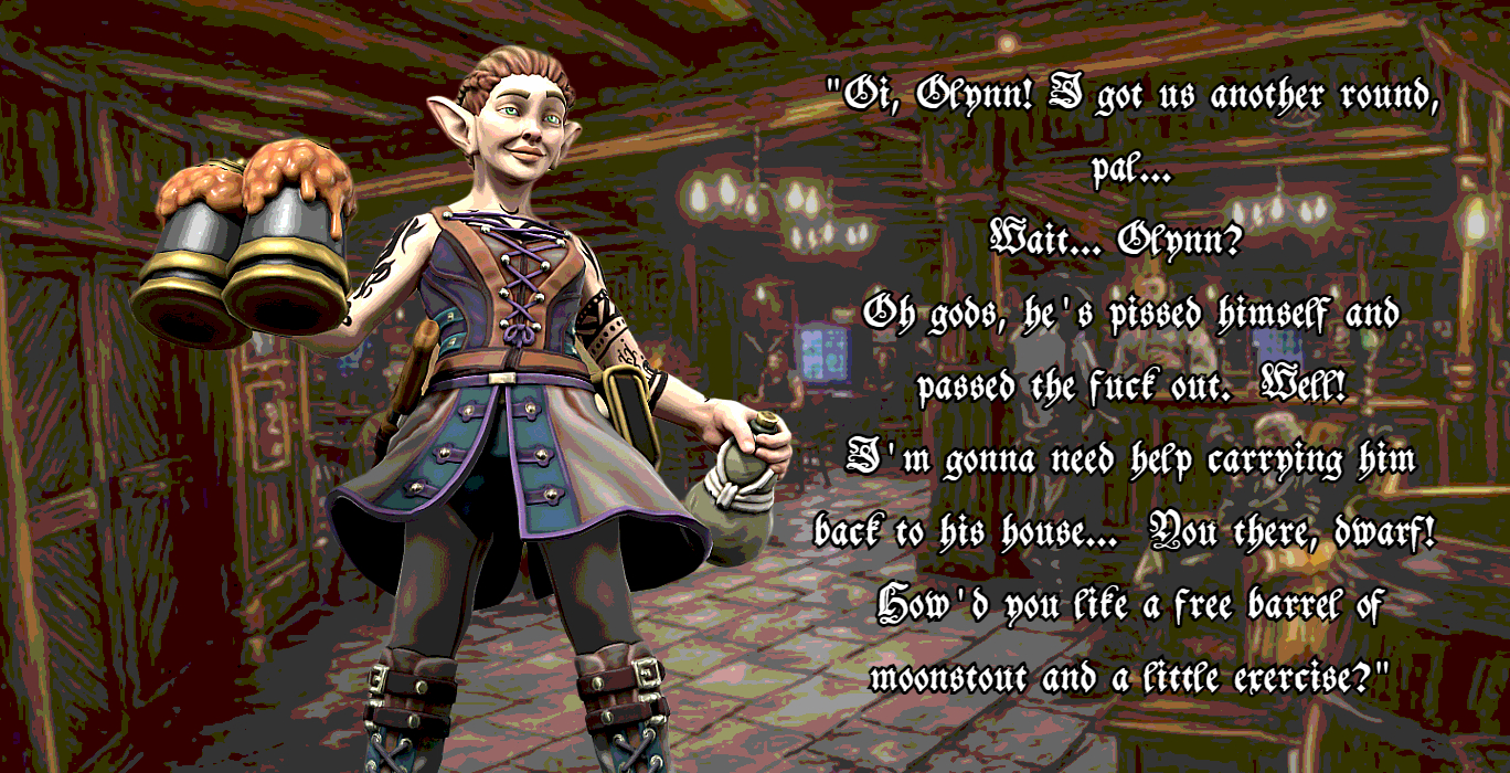 I think I’ll head down to the Diving Dolphin tonight. Mirnan’s working and maybe Olynn will be there. There’s a new ale I’ve been hankering to try, and I’m sure I’ll be able to outdrink Olynn tonight. Blame it on my “elvish heritage”.