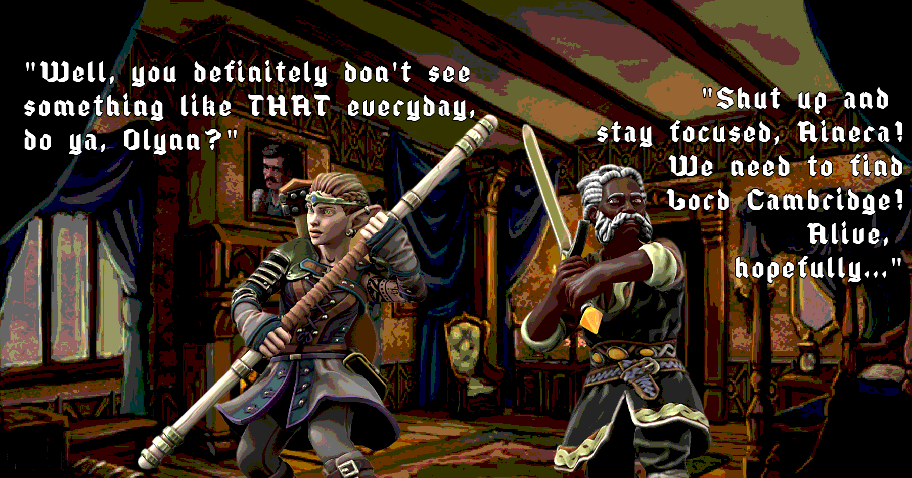 With the doppelganger defeated, Olynn and I warily returned to the first floor where he told me that while he was facing off with the doppelganger (around the moment I’d discovered Cambridge’s corpse) that the doppelganger (still disguised as Cambridge) revealed his motivations. Based on what Olynn and I could piece together, the doppelganger basically had been told about Cambridge manor and was in fact encouraged to steal the identity of Lord Cambridge and take over his manor. I asked Olynn if he knew who told the doppelganger to take over Cambridge manor but he said he didn’t know (he’d diced the doppelganger to bits at that point).