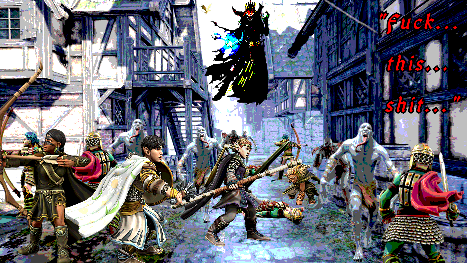 My mates were scattered throughout the town so it took ‘em a little while to convene but we held 'em all off! The first wave was all ghouls, which seem to require a lot to put down even though they’re pretty easy to hit on account of they’re slow and dumb. The next wave was skeletons- hard to hit cuz they’re all bones and can dodge well. Eventually priests of Lathander and Angharradh came to help, their arcane blasts of radiant magic reducing the numbers of undead in the streets. I used my shillelagh spell to enchant my quarterstaff with a little extra oomph, which definitely helped. Here and there I was able to pluck a few magic notes on my yarting which helped keep everyone feeling eager and willing to decimate these creatures.